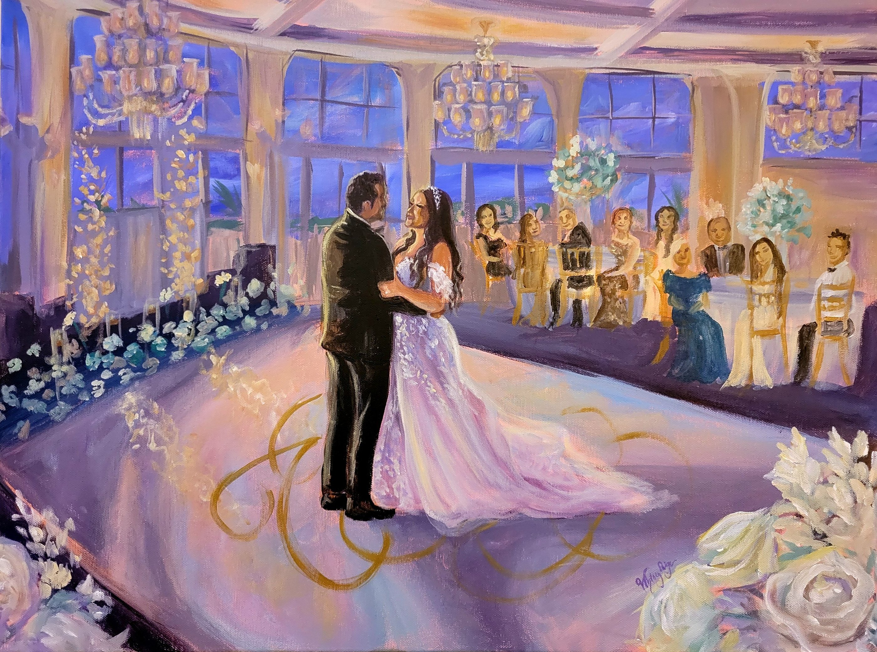 This package will have our couple center stage, but can also include guests in the background, rendered in an impressionistic style. This package includes 2-3 hours of painting before the start of the wedding and an additional 4-5 hours of painting during reception.