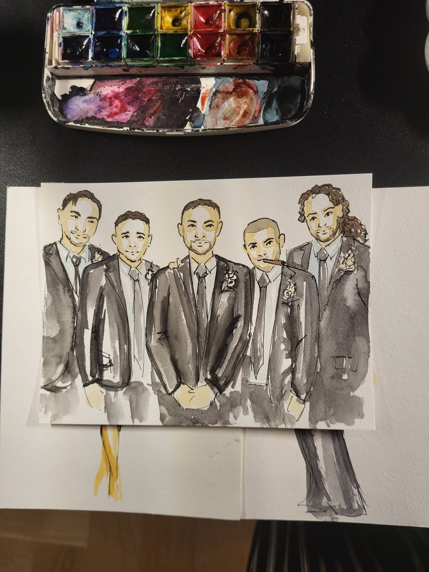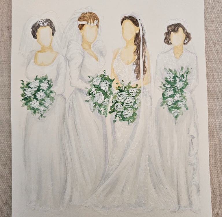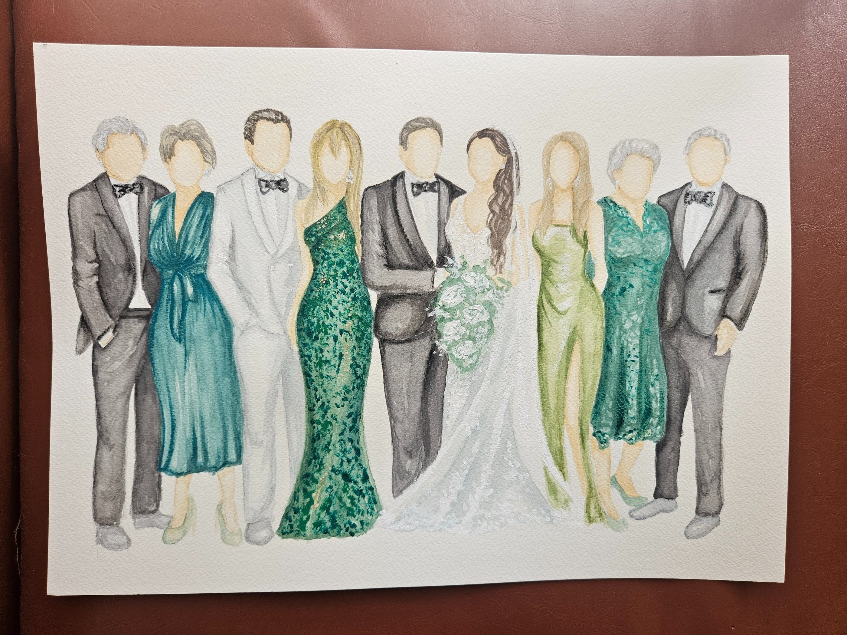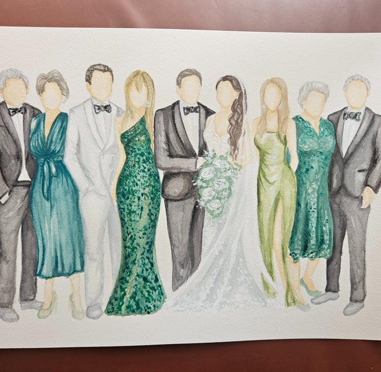 This in-studio–exclusive service is created from images submitted prior to your event. Each family or generational watercolor sketch is thoughtfully illustrated ahead of time, capturing meaningful details and relationships in a soft, timeless style.